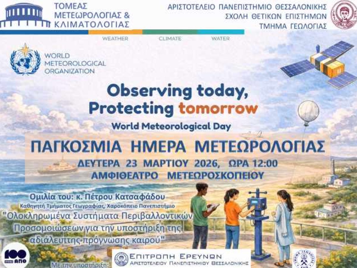 Τα σύγχρονα συστήματα πρόγνωσης καιρού θα «βρεθούν» στο επίκεντρο της εκδήλωσης, την οποία θα πραγματοποιήσει ο Τομέας Μετεωρολογίας και Κλιματολογίας του Τμήματος Γεωλογίας του Αριστοτελείου Πανεπιστημίου Θεσσαλονίκης στις 12 το μεσημέρι της Δευτέρας 23 Μαρτίου 2026 στο Μετεωροσκοπείο του ΑΠΘ